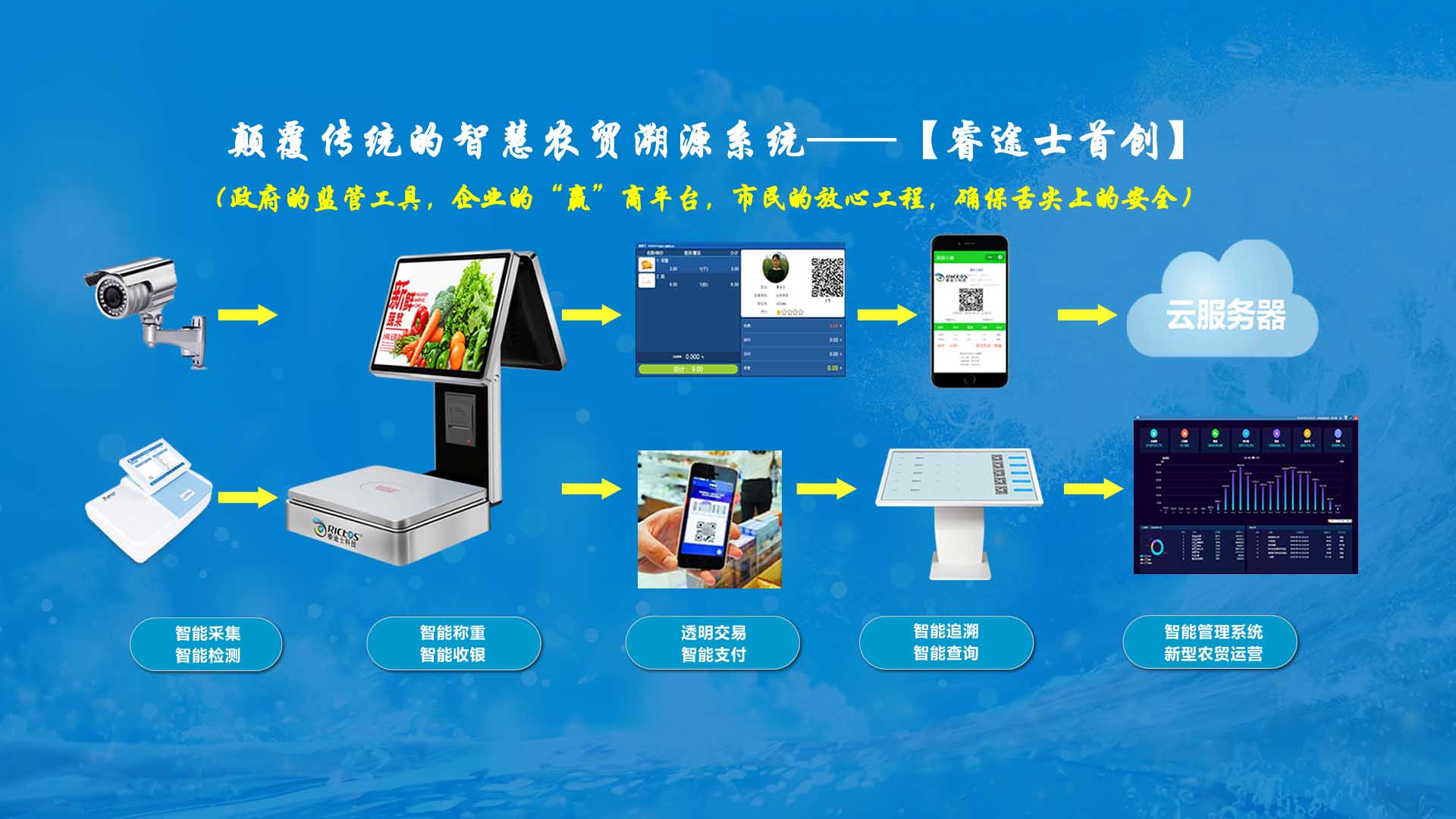 創新實現了【智慧農貿溯源管理系統】與【智能稱重收銀】一體化解決方案,集市場管理、運營管理、溯源追溯、智能收銀大數據運用于一體,硬件、軟件與管理系統完美結合。適用于農批、農貿市場蔬菜、生鮮、水果、水產、肉類、熟食等稱重和非稱重銷售;由于采用一體化設計,解決了傳統農貿市場無法實現的信息化、智能化、可追溯的管理問題;使稱重、收銀、追溯、管理、更透明、公正、安全,讓顧客無后顧之憂,給管理工作帶來極大的便捷與高效,對國內農產品行業的發展、農產品流通管理起到了典范作用。 【睿途士首創】顛覆傳統的“智慧農貿市場系統”,解決了傳統農貿系統單一安卓掛屏,昂視不方便看、不直觀、無互動性,傳輸信息不齊全、不穩定的問題,也解決了按鍵電子秤商品難找、商品代碼難記、按鍵操作不靈活、支付不智能,對收銀管理、銷售商品、菜名、菜價、打折、優惠、會員、線上下單、采購等無法實現實際菜品交易和追溯等問題。 更具顛覆性的是睿途士智慧系統擁有三大管理平臺(市場管理平臺、總部運營管理平臺、商戶后臺管理平臺)、一個可視操作前臺和三大追溯功能,讓遠程管理、數據傳輸、人機互動、智能控制、移動支付、大數據、互聯通信、云端存儲、人工智能、智能城市、電子定位、智能收銀等功能得以實現。